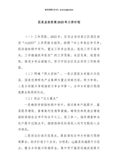 / 【七哥公文】2024年:区农业农村局2025年工作计划+更多免费公文+VX:QiGeGongWen2024