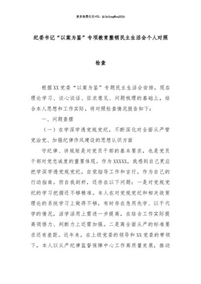 【七哥公文】2024年:纪委书记“以案为鉴”专项教育整顿民主生活会个人对照检查+更多免费公文+VX:QiGeGongWen2024