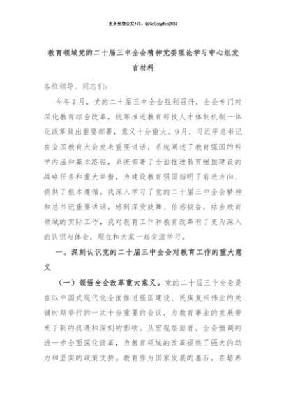 【七哥公文】2024年:教育领域党的二十届三中全会精神党委理论学习中心组发言材料+更多免费公文+VX:QiGeGongWen2024