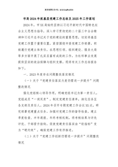 【七哥公文】2024年:市局2024年抓基层党建工作总结及2025年工作谋划+更多免费公文+VX:QiGeGongWen2024