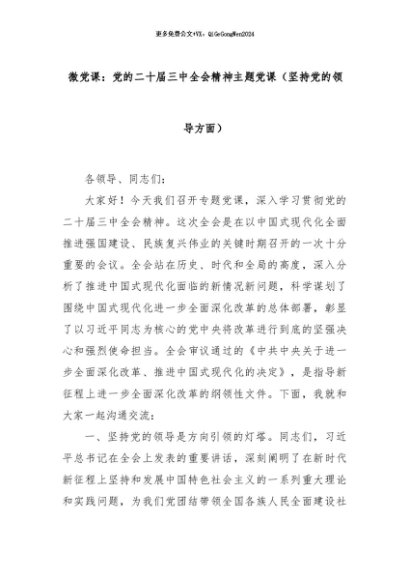 【七哥公文】2024年:微党课:党的二十届三中全会精神主题党课(坚持党的领导方面)+更多免费公文+VX:QiGeGongWen2024
