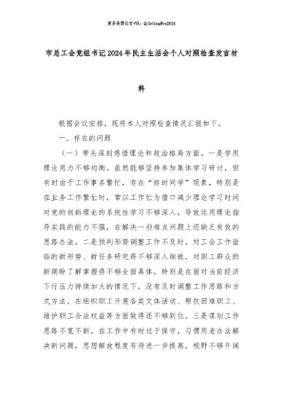 【七哥公文】2024年:市总工会党组书记2024年民主生活会个人对照检查发言材料+更多免费公文+VX:QiGeGongWen2024