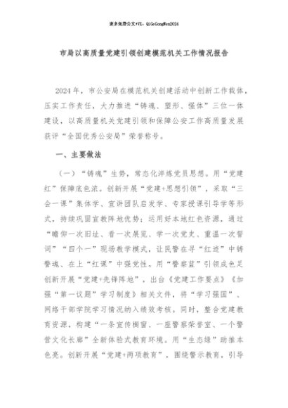 / 【七哥公文】2024年:市局以高质量党建引领创建模范机关工作情况报告+更多免费公文+VX:QiGeGongWen2024
