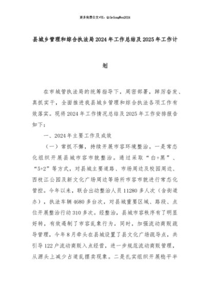 【七哥公文】2024年:县城乡管理和综合执法局2024年工作总结及2025年工作计划+更多免费公文+VX:QiGeGongWen2024