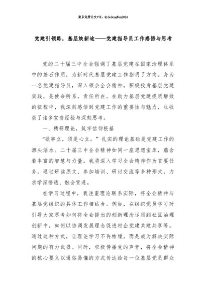 【七哥公文】2024年:党建引领路,基层焕新途——党建指导员工作感悟与思考+更多免费公文+VX:QiGeGongWen2024