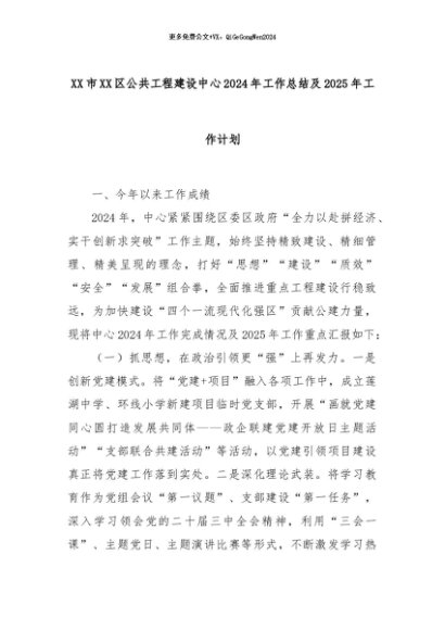 【七哥公文】2024年:XX市XX区公共工程建设中心2024年工作总结及2025年工作计划+更多免费公文+VX:QiGeGongWen2024