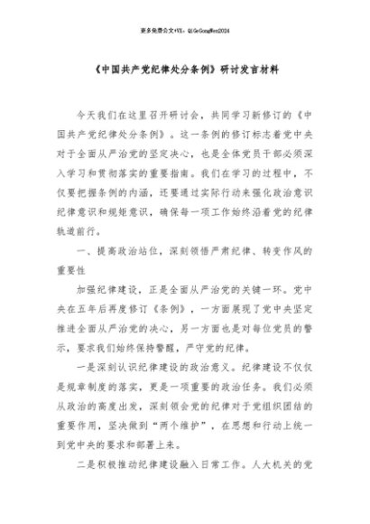 / 【七哥公文】2024年:《中国共产党纪律处分条例》研讨发言材料+更多免费公文+VX:QiGeGongWen2024