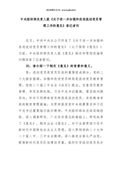 【七哥公文】2024年:中央组织部负责人就《关于进一步加强和改进流动党员管理工作的意见》答记者问+更多免费公文+VX:QiGeGongWen2024