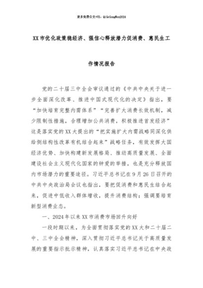 【七哥公文】2024年:XX市优化政策稳经济、强信心释放潜力促消费、惠民生工作情况报告+更多免费公文+VX:QiGeGongWen2024