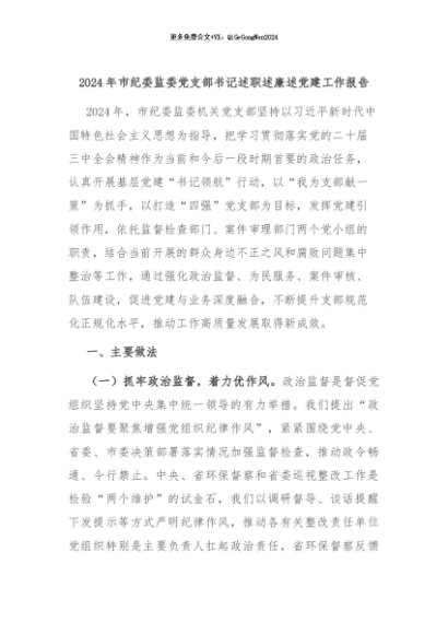 【七哥公文】2024年:2024年市纪委监委党支部书记述职述廉述党建工作报告+更多免费公文+VX:QiGeGongWen2024