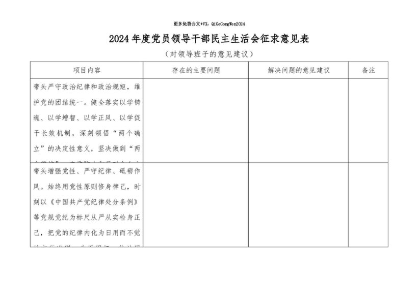 【七哥公文】2024年:2024年度党员领导干部民主生活会征求意见表(按四个带头)+更多免费公文+VX:QiGeGongWen2024