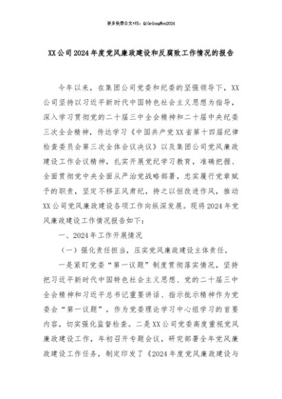 【七哥公文】2024年:XX公司2024年度党风廉政建设和反腐败工作情况的报告+更多免费公文+VX:QiGeGongWen2024
