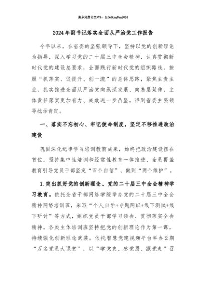 / 【七哥公文】2024年:2024年副书记落实全面从严治党工作报告+更多免费公文+VX:QiGeGongWen2024