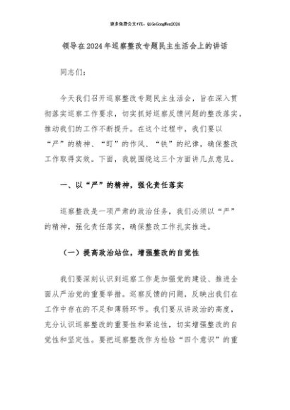 【七哥公文】2024年:领导在2024年巡察整改专题民主生活会上的讲话+更多免费公文+VX:QiGeGongWen2024+更多免费公文+VX:QiGeGongWen2024