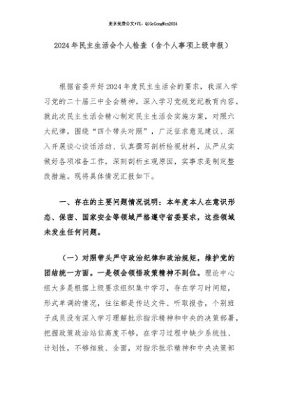 【七哥公文】2024年:2024年民主生活会个人检查(含个人事项上级申报)+更多免费公文+VX:QiGeGongWen2024+更多免费公文+VX:QiGeGongWen2024