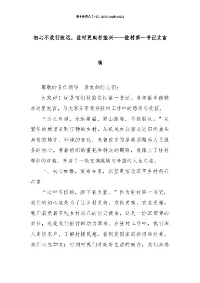 【七哥公文】2024年:初心不改行致远,驻村更助村振兴——驻村第一书记发言稿+更多免费公文+VX:QiGeGongWen2024+更多免费公文+VX:QiGeGongWen2024