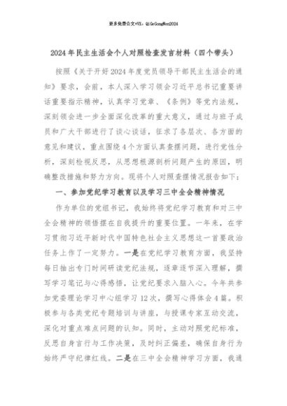 【七哥公文】2024年:2024年民主生活会个人对照检查发言材料(四个带头)+更多免费公文+VX:QiGeGongWen2024+更多免费公文+VX:QiGeGongWen2024