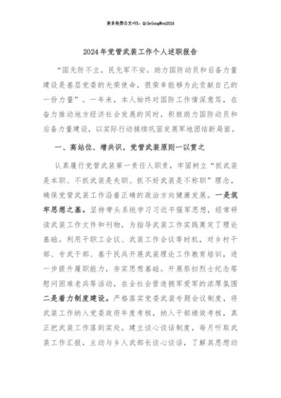 【七哥公文】2024年:2024年党管武装工作个人述职报告+更多免费公文+VX:QiGeGongWen2024+更多免费公文+VX:QiGeGongWen2024
