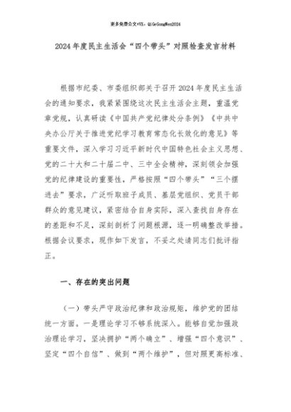 【七哥公文】2024年:2024年度民主生活会“四个带头”对照检查发言材料+更多免费公文+VX:QiGeGongWen2024+更多免费公文+VX:QiGeGongWen2024