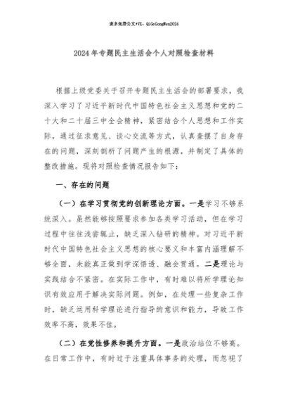 【七哥公文】2024年:2024年专题民主生活会个人对照检查材料+更多免费公文+VX:QiGeGongWen2024+更多免费公文+VX:QiGeGongWen2024