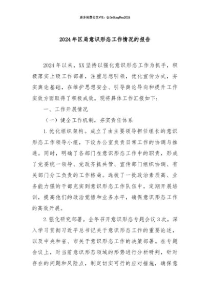 【七哥公文】2024年:2024年区局意识形态工作情况的报告+更多免费公文+VX:QiGeGongWen2024+更多免费公文+VX:QiGeGongWen2024