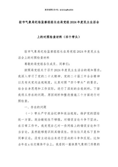 【七哥公文】2024年:驻市气象局纪检监察组组长在局党组2024年度民主生活会上的对照检查材料(四个带头)+更多免费公文+VX:QiGeGongWen2024