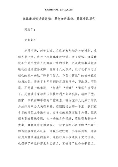 / 【七哥公文】2024年:集体廉政谈话讲话稿:坚守廉洁底线,共筑清风正气+更多免费公文+VX:QiGeGongWen2024