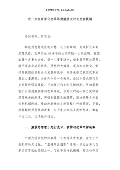 / 【七哥公文】2024年:进一步全面深化改革思想解放大讨论发言提纲+更多免费公文+VX:QiGeGongWen2024
