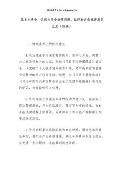 【七哥公文】2024年:(60条)民主生活会、组织生活会查摆问题、批评和自我批评意见汇总+更多免费公文+VX:QiGeGongWen2024+更多免费公文+VX:QiGeGongWen2024