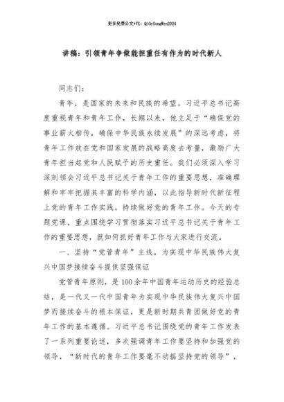 / 【七哥公文】2024年:讲稿:引领青年争做能担重任有作为的时代新人+更多免费公文+VX:QiGeGongWen2024