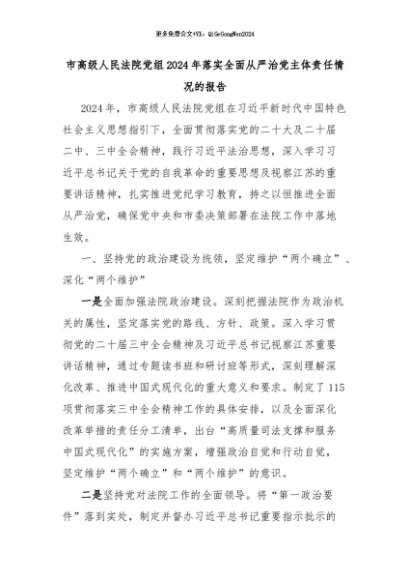 【七哥公文】2024年:市高级人民法院党组2024年落实全面从严治党主体责任情况的报告+更多免费公文+VX:QiGeGongWen2024