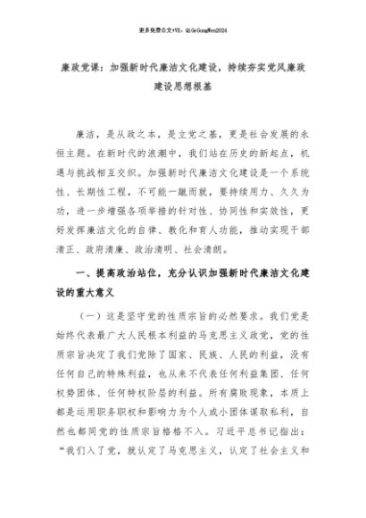 【七哥公文】2024年:廉政党课:加强新时代廉洁文化建设,持续夯实党风廉政建设思想根基+更多免费公文+VX:QiGeGongWen2024