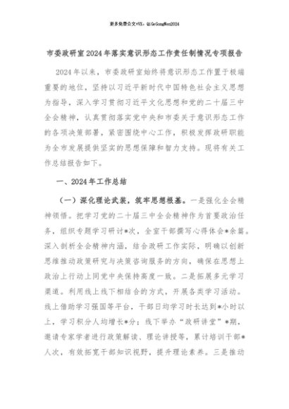 【七哥公文】2024年:市委政研室2024年落实意识形态工作责任制情况专项报告+更多免费公文+VX:QiGeGongWen2024