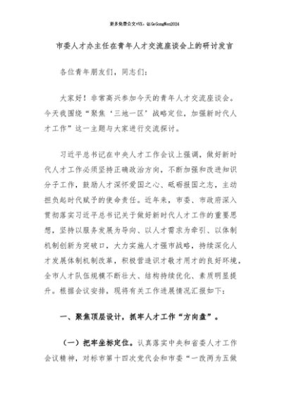 / 【七哥公文】2024年:市委人才办主任在青年人才交流座谈会上的研讨发言+更多免费公文+VX:QiGeGongWen2024