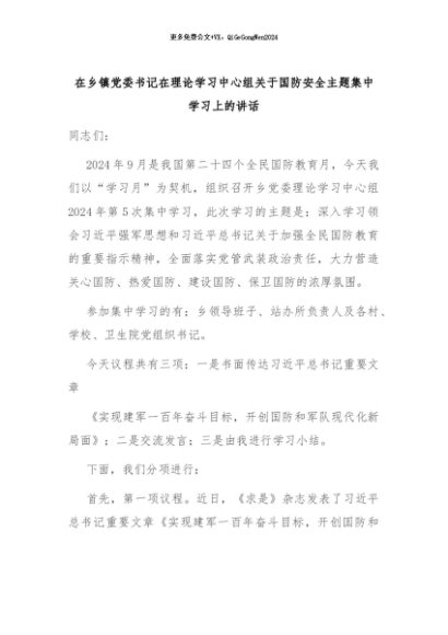 【七哥公文】2024年:在乡镇党委书记在理论学习中心组关于国防安全主题集中学习上的讲话+更多免费公文+VX:QiGeGongWen2024