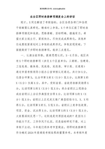 / 【七哥公文】2024年:在全区即时表扬事项调度会上的讲话+更多免费公文+VX:QiGeGongWen2024