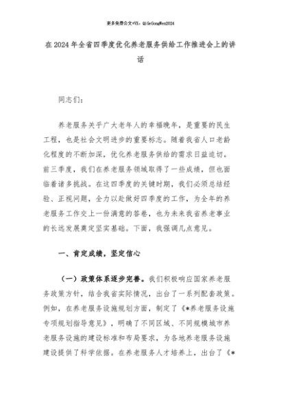 【七哥公文】2024年:在2024年全省四季度优化养老服务供给工作推进会上的讲话+更多免费公文+VX:QiGeGongWen2024