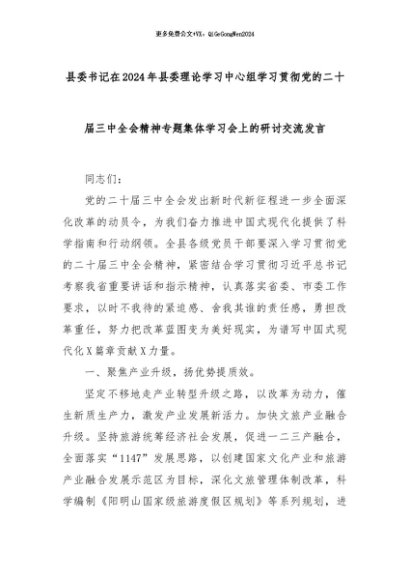 【七哥公文】2024年:县委书记在2024年县委理论学习中心组学习贯彻党的二十届三中全会精神专题集体学习会上的研讨交流发言+更多免费公文+VX:QiGeGongWen2024
