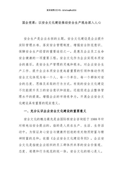 / 【七哥公文】2024年:国企党课:以安全文化建设推动安全生产观念深入人心+更多免费公文+VX:QiGeGongWen2024