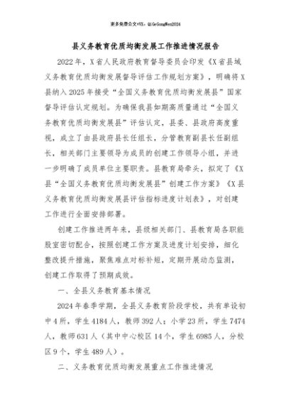 / 【七哥公文】2024年:县义务教育优质均衡发展工作推进情况报告+更多免费公文+VX:QiGeGongWen2024