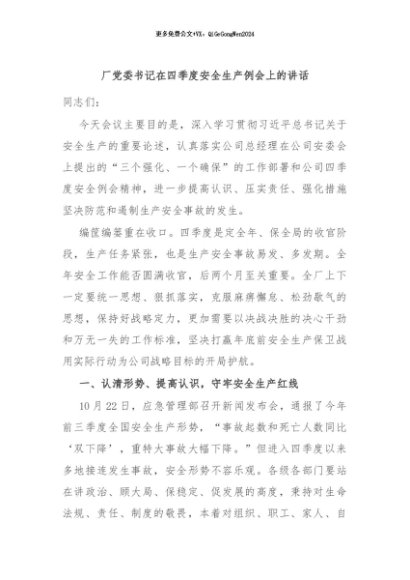 / 【七哥公文】2024年:厂党委书记在四季度安全生产例会上的讲话+更多免费公文+VX:QiGeGongWen2024