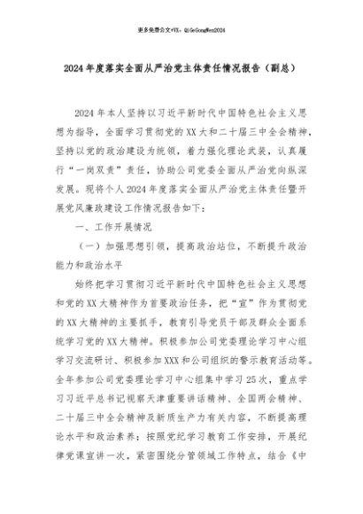 【七哥公文】2024年:2024年度落实全面从严治党主体责任情况报告(副总)+更多免费公文+VX:QiGeGongWen2024