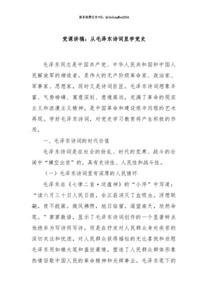 / 【七哥公文】2024年:党课讲稿:从毛泽东诗词里学党史+更多免费公文+VX:QiGeGongWen2024