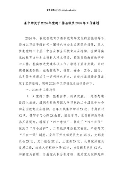 【七哥公文】2024年:某中学关于2024年党建工作总结及2025年工作谋划+更多免费公文+VX:QiGeGongWen2024