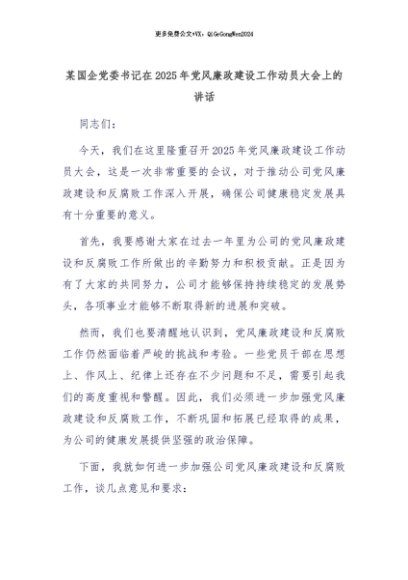 【七哥公文】2024年:某国企党委书记在2025年党风廉政建设工作动员大会上的讲话+更多免费公文+VX:QiGeGongWen2024