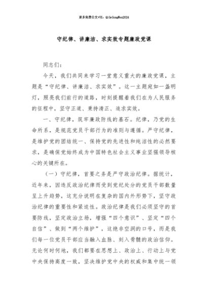 / 【七哥公文】2024年:守纪律、讲廉洁、求实效专题廉政党课+更多免费公文+VX:QiGeGongWen2024