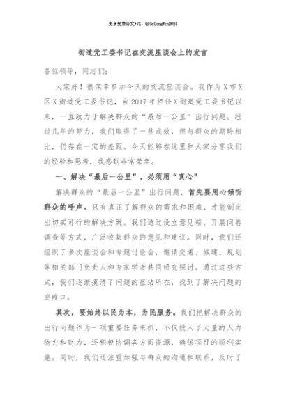 / 【七哥公文】2024年:街道党工委书记在交流座谈会上的发言+更多免费公文+VX:QiGeGongWen2024