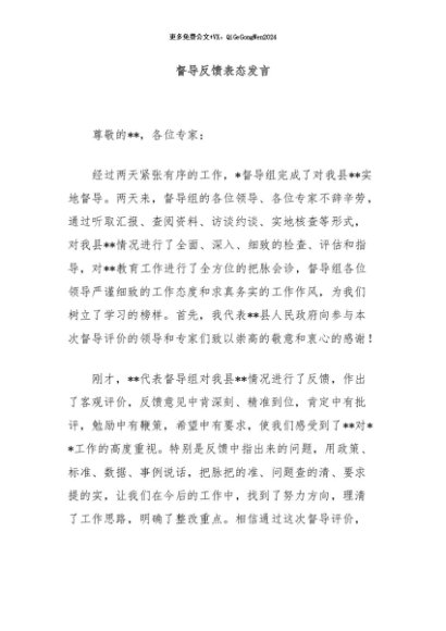 【七哥公文】2024年:督导反馈表态发言+更多免费公文+VX:QiGeGongWen2024