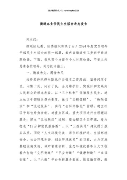 / 【七哥公文】2024年:街道办主任民主生活会表态发言+更多免费公文+VX:QiGeGongWen2024