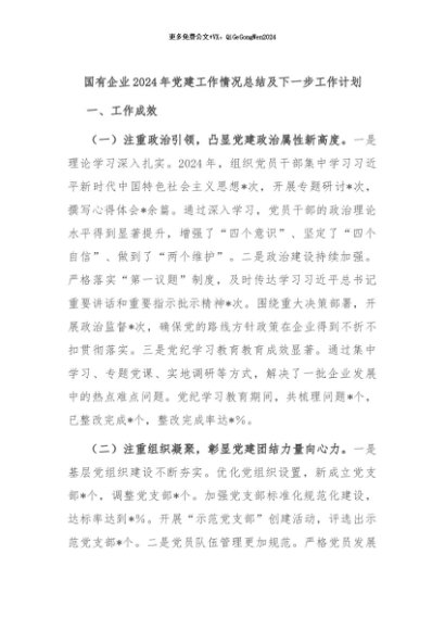 【七哥公文】2024年:国有企业2024年党建工作情况总结及下一步工作计划+更多免费公文+VX:QiGeGongWen2024